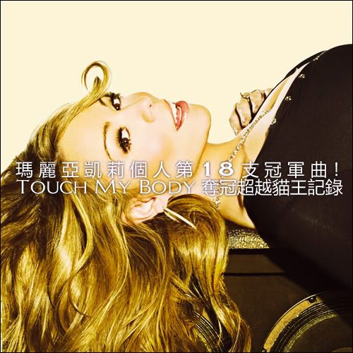 從一炮而紅到感情和事業都跌落谷底,甚至還一度傳出情緒崩潰的消息,然後又重新振作回到巔峰,瑪麗亞凱莉(Mariah Carey)無論在私生活或是音樂事業方面的歷程,都充滿了戲劇性。從上一張專輯「天后再臨(The Emancipation Of Mimi)」開始,瑪麗亞又重新穩穩站上了流行天后的位置,而從她最新專輯「蝴蝶效應(E=MC2)」裡所選出來的首支單曲《Touch My Body》又在這星期勇奪全美單曲榜冠軍,這已經是她的第18首冠軍曲,也讓她一舉成為有史以來在全美單曲榜上得到最多冠軍單曲的個人歌手─目前擁有最多首冠軍曲的是披頭四(The Beatles),但他們是團體,這項紀錄甚至還超越了貓王艾維斯普里斯萊(Elvis Presley)的成績,而且貓王已逝,披頭四也不太可能重組,但瑪麗亞還不到四十歲,現在人氣又如日中天,未來單曲成績超越貓王更多甚至超越披頭四的20首冠軍曲紀錄對於瑪麗亞來說顯然並非難事。